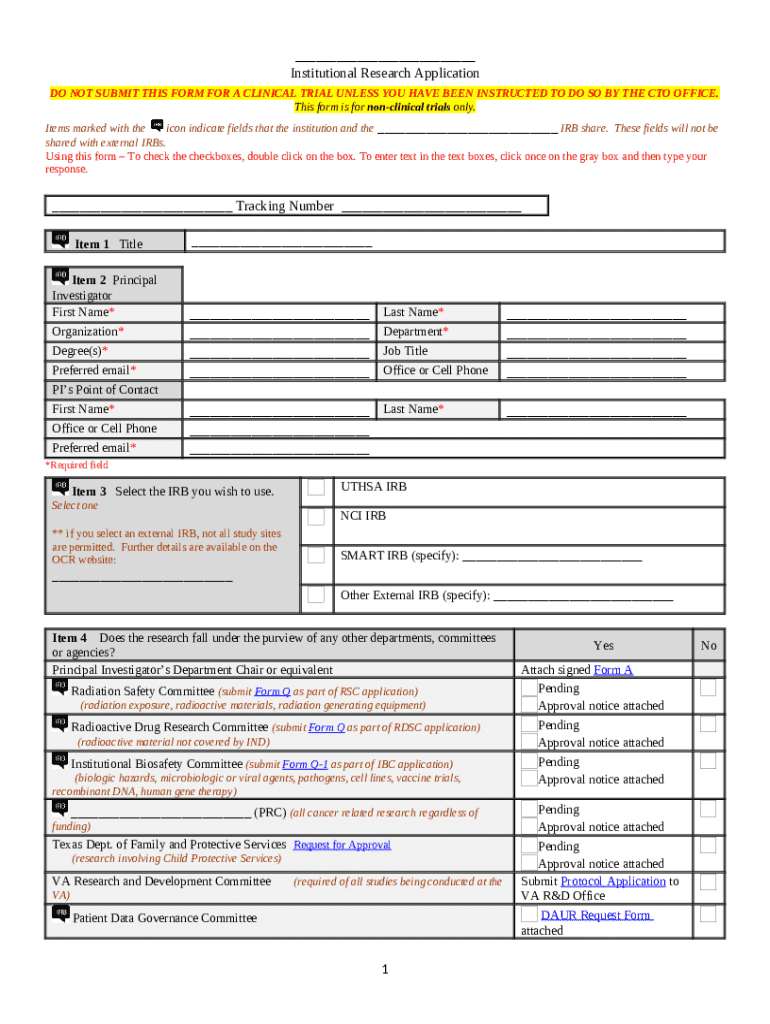 The institutional research application form serves as a crucial tool for researchers seeking approval to conduct non-clinical trials within an institution. This form collects necessary information to ensure that the research adheres to ethical standards and institutional guidelines. However, it is important to note that this form should not be used for clinical trials unless directed by the Chief Technology Officer (CTO) Office.