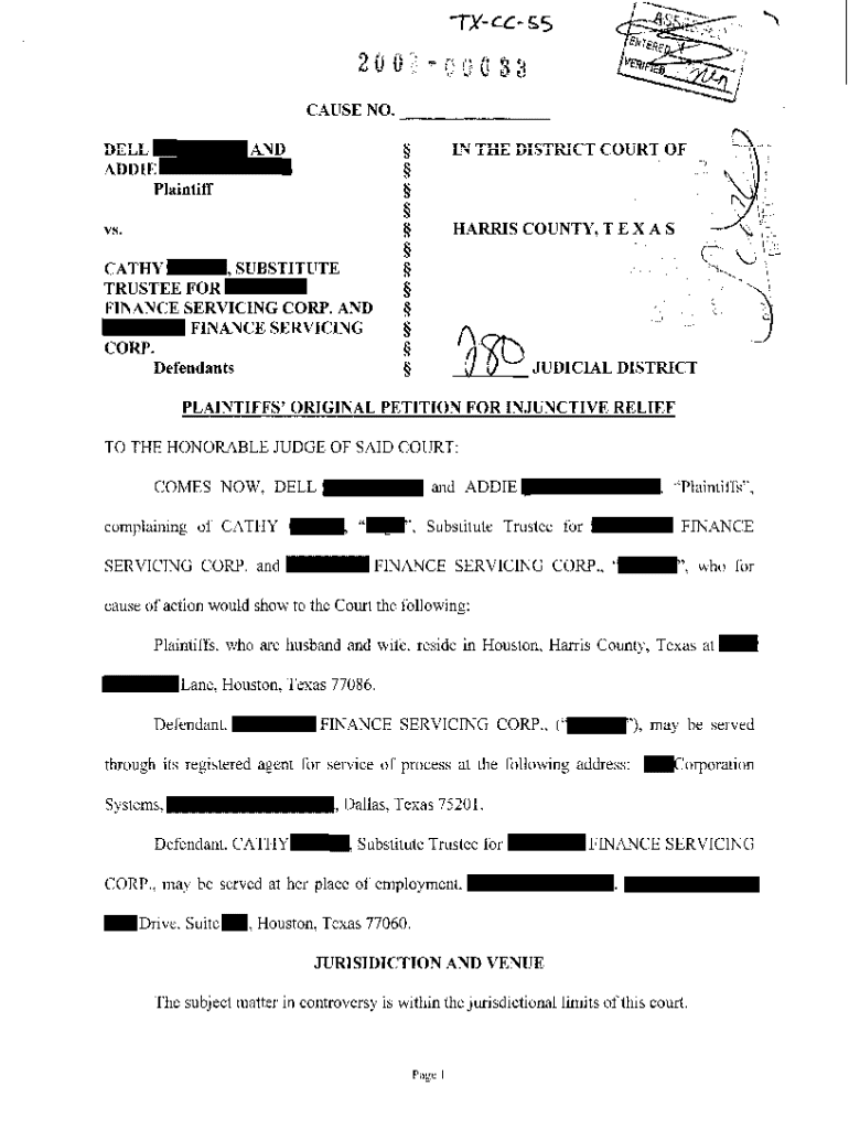 Get the free A01 Plaintiff's Petition for Injunctive Relief, Fraud and Estoppels regarding Forecl...