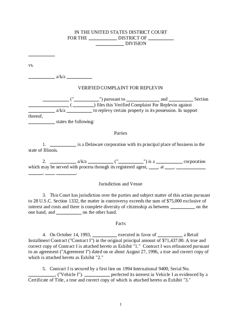 How should you fill out the Verified Complaint for Replevin or Repossession template