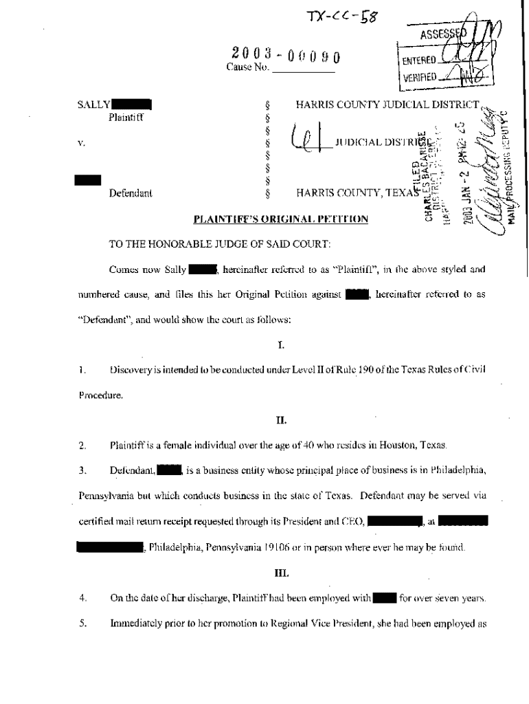Get the free A01 Plaintiff's Original Petition for Employment Termination due to Sex Discrimination