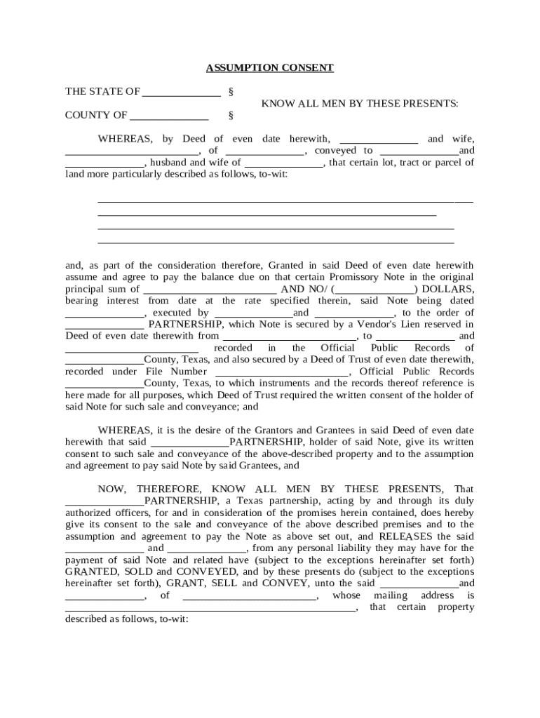 Assumption consent is a legal document that allows one party to assume the obligations and rights of another party under a contract or agreement.