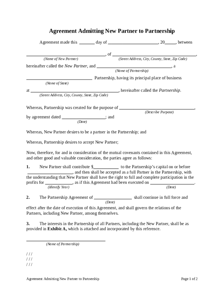 An agreement admitting new partner is a legal document that formalizes the inclusion of a new partner into an existing partnership.