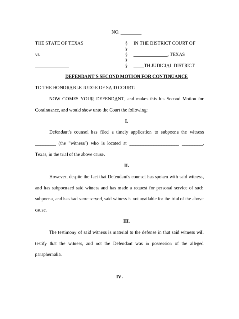 A well-structured motion should clearly introduce the defendant's counsel and delineate the reasons behind the request for continuance. This includes detailing the importance of the absent witness and how their testimony could impact the case.