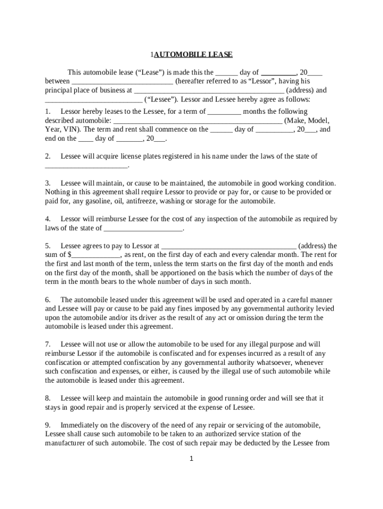 An Automobile Lease Agreement is generally used to describe the formal contract or agreement that binds the leasing customer to the terms and conditions set forth by a leasing company or bank (financier)