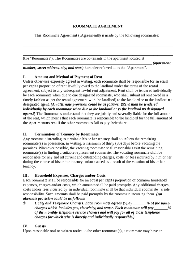 The following form is an agreement which can be adapted to either school roommates or roommates who are sharing expenses for other reasons.