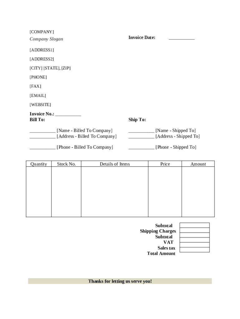 Subtotal, shipping charges, VAT, and sales tax must be calculated correctly to reflect the total amount due.