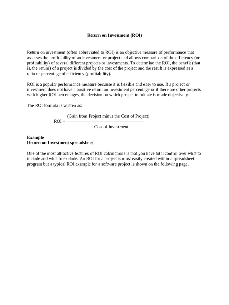 For instance, if a project cost $100,000 and generated a revenue of $150,000, the ROI would be ($150,000 - $100,000) / $100,000 = 0.5, or 50%.