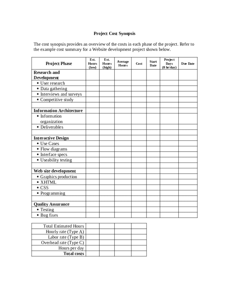The project cost synopsis consists of various phases that need careful estimation. Each component contributes to the overall understanding of potential expenses and ensures that no aspect of the project is overlooked.