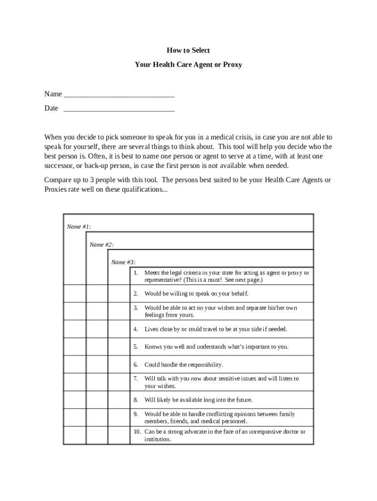 Get the free Tool for Selecting Your Health Care Agent or Proxy template
