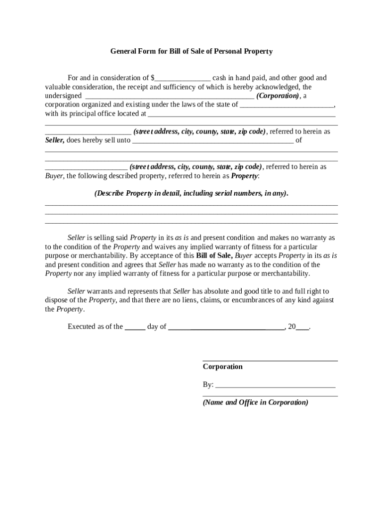 This form is a general form of a bill of sale for personal property (i.e. goods). It should not be used to convey title to real property or title to a motor vehicle.