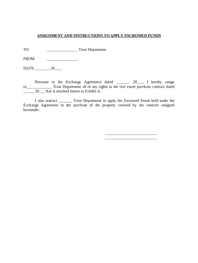 Grantor assigns all of his/her rights in a real estate purchase contract to a certain trust department. Grantor also directs the trust department to apply escrowed funds held under the exchange agreement
