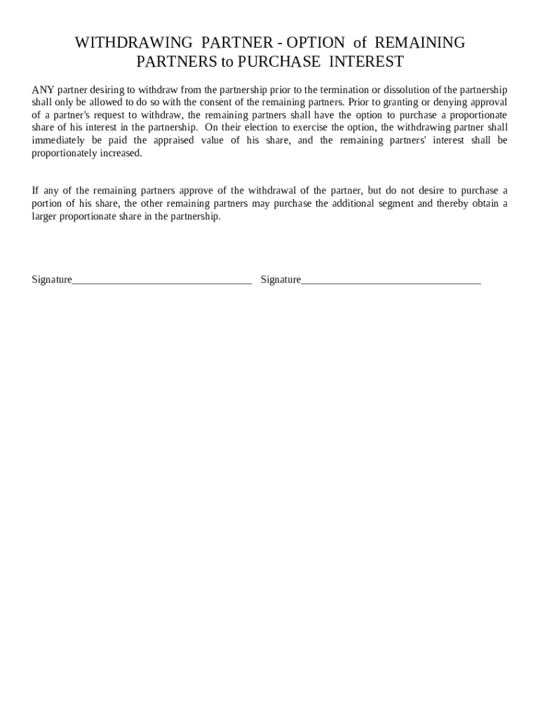 This option allows remaining partners to buy out the withdrawing partner's share, preserving ownership.