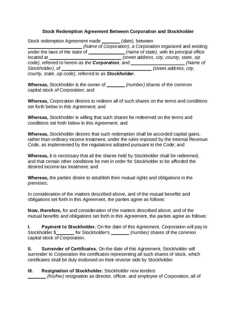 A stock redemption agreement between is a legal document that outlines the terms under which a corporation purchases back its shares from shareholders.
