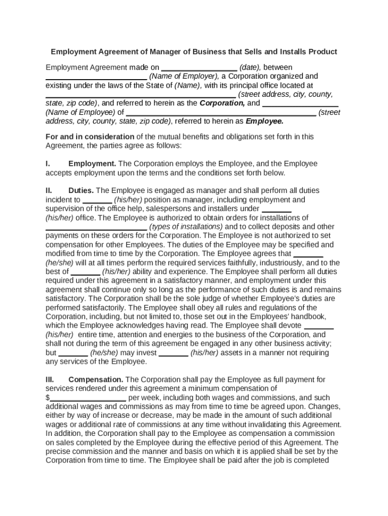 This form is an employment agreement of a manager of a business that sells and installs a product.