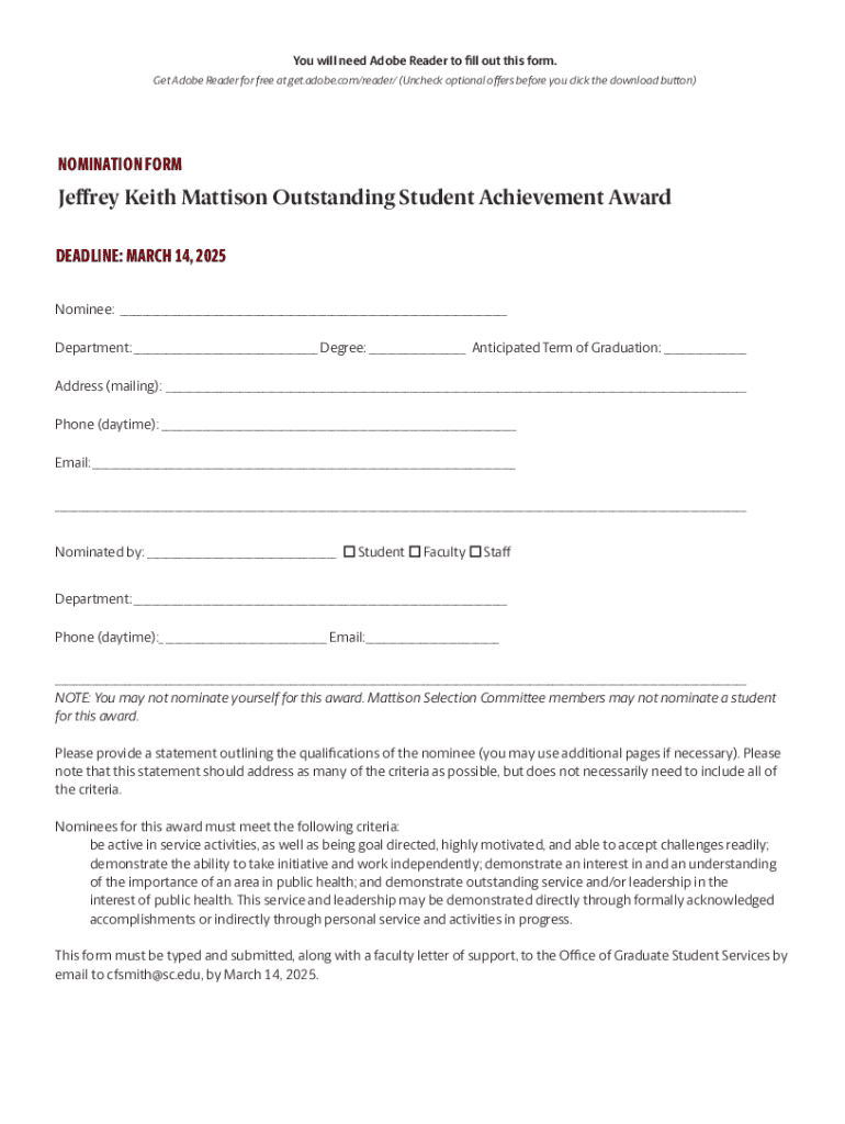 This form is used to nominate a graduating Master\'s level student for the 2025 Jeffrey Keith Mattison Outstanding Student Achievement Award, honoring the qualities of Jeffrey Keith Mattison and recognizing
