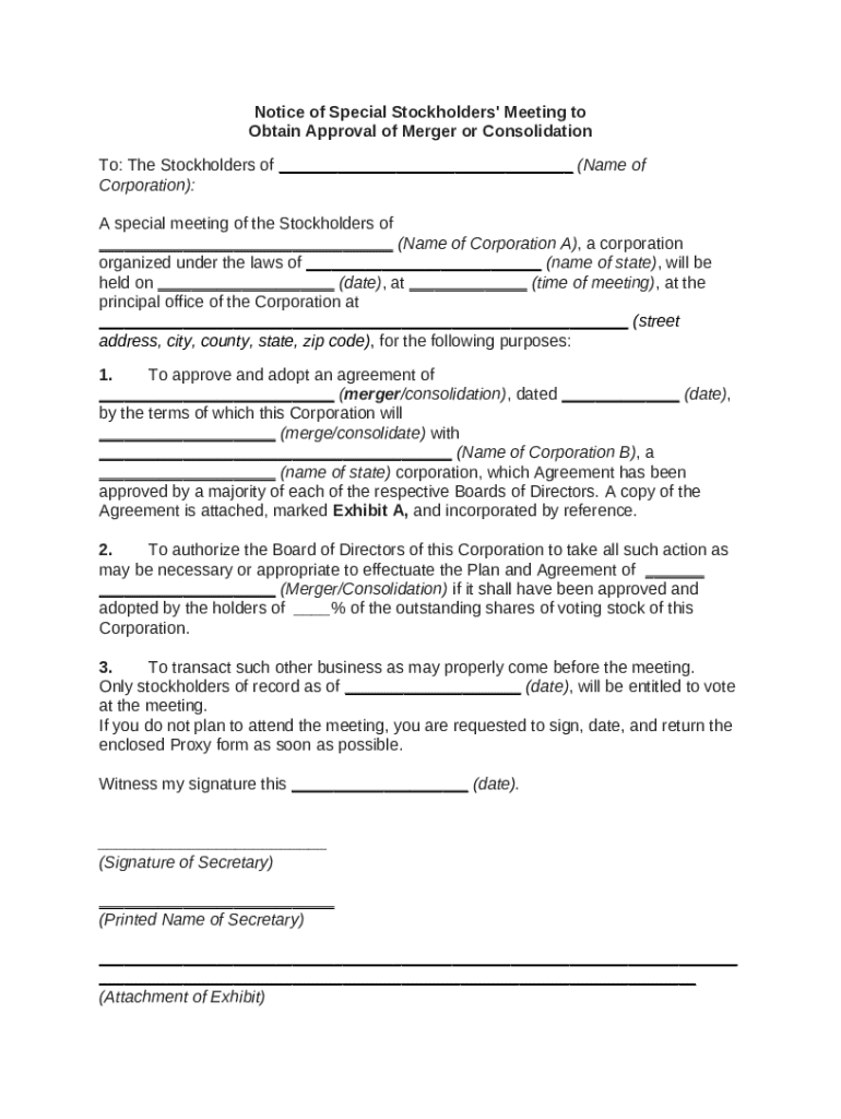 Get the free Notice of Special Stockholders' Meeting to Obtain Approval of Merger or Consolidatio...