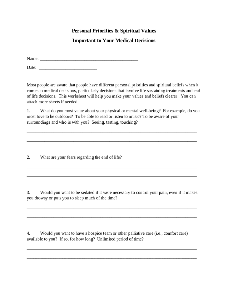 The form encourages delineation of core priorities, such as well-being and relationships, that guide medical decisions.