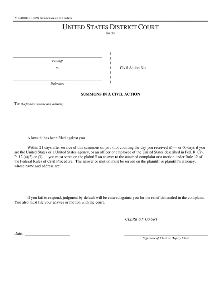 Understanding the structure of a federal court form is crucial for anyone involved in the legal process. The AO Rev Summons in a Civil Action includes necessary fields that must be accurately filled out to be valid. Each component plays a significant role in the court’s comprehension of the case.