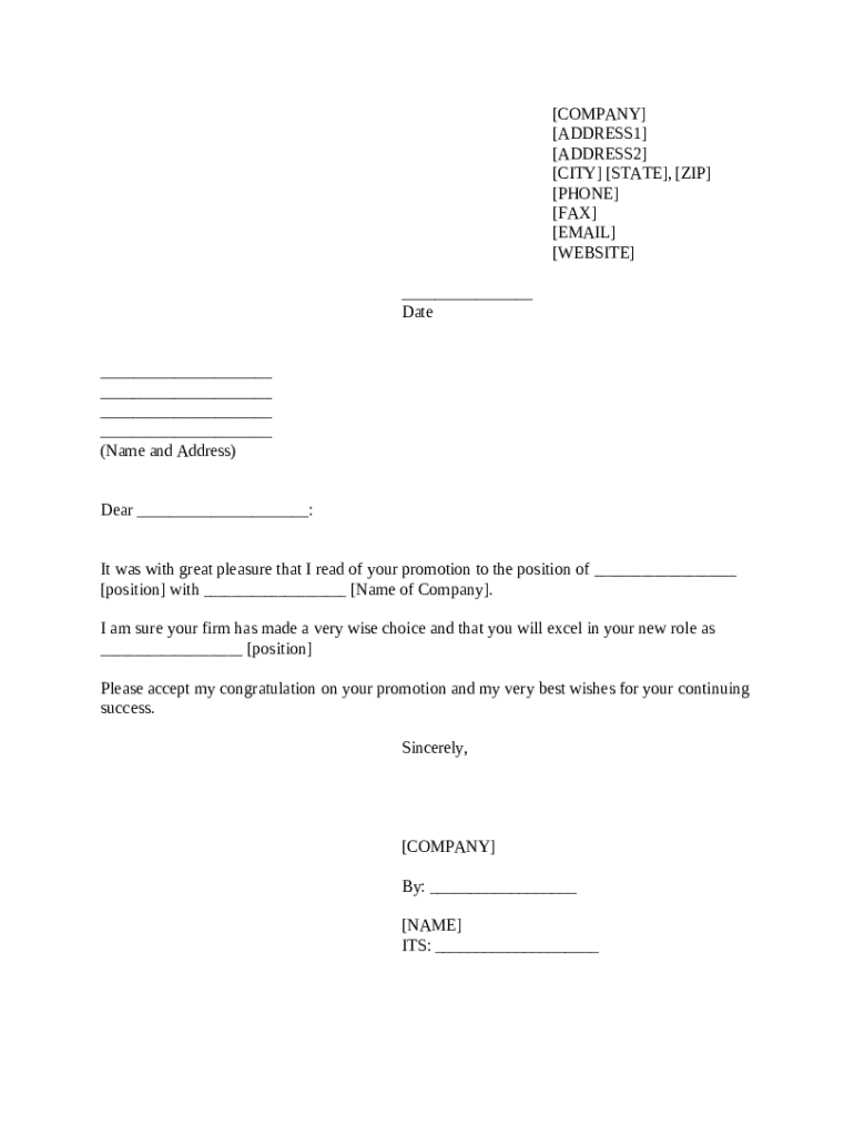 A document template used to formally congratulate someone on their promotion at work.