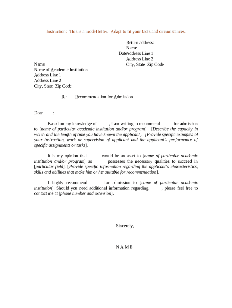 This form is a template for a letter of recommendation for admission to an academic institution and/or program. It can be adapted to fit your particular circumstances.