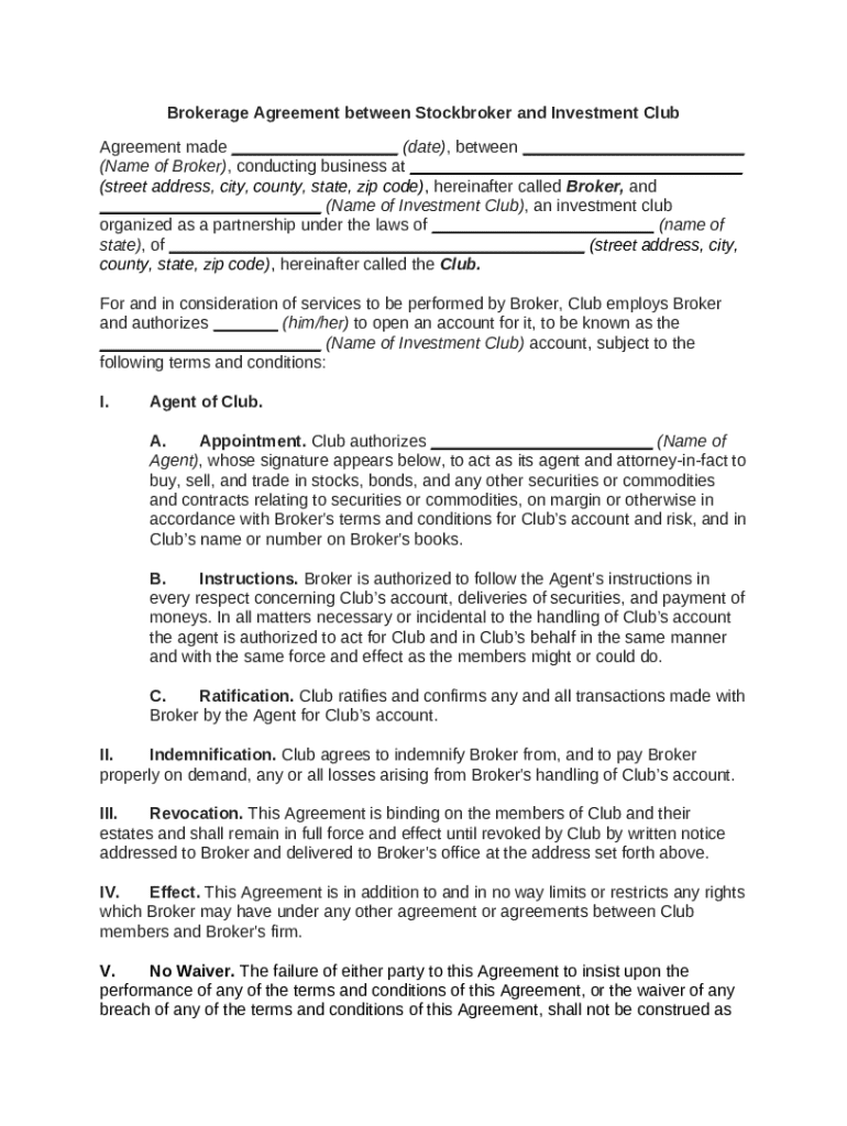 A brokerage agreement is a legally binding document between a stockbroker and their client, often in the context of an investment club. This agreement outlines the broker's responsibilities, the services they will provide, and the terms under which they will operate. It's crucial for investment clubs to have this agreement as it establishes a clear framework for operations and protects the interests of both parties.