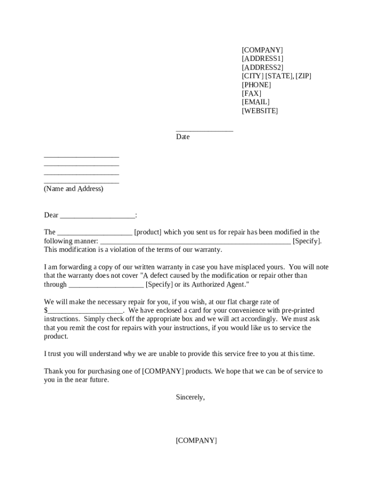Get the free Notice of Violation of Warranty Exclusion template