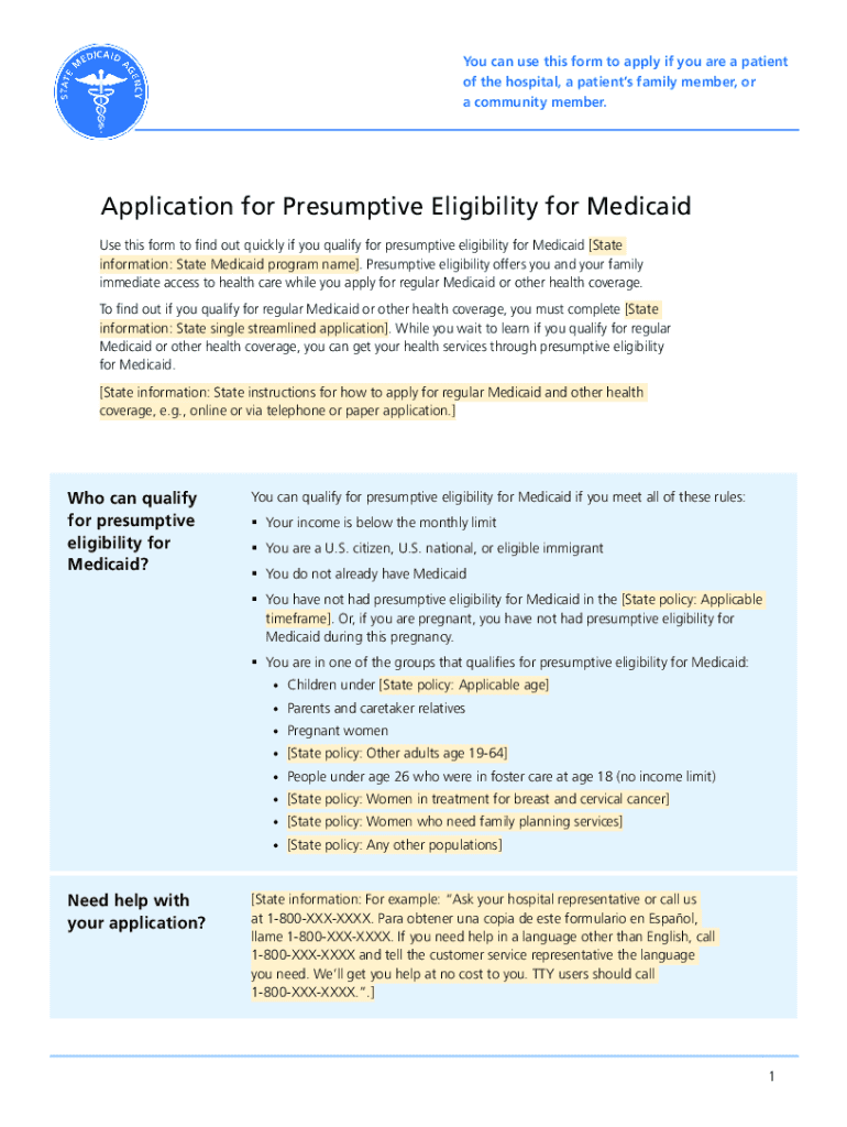 Use this form to find out quickly if you qualify for presumptive eligibility for Medicaid. Presumptive eligibility offers you and your family immediate access to health care while you apply for regular