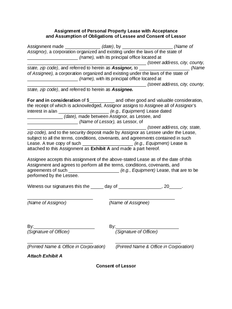 What is Assignment of Personal Property Lease with Acceptance and Assumption of Obligations of Lessee and Consent of Lessor Form?