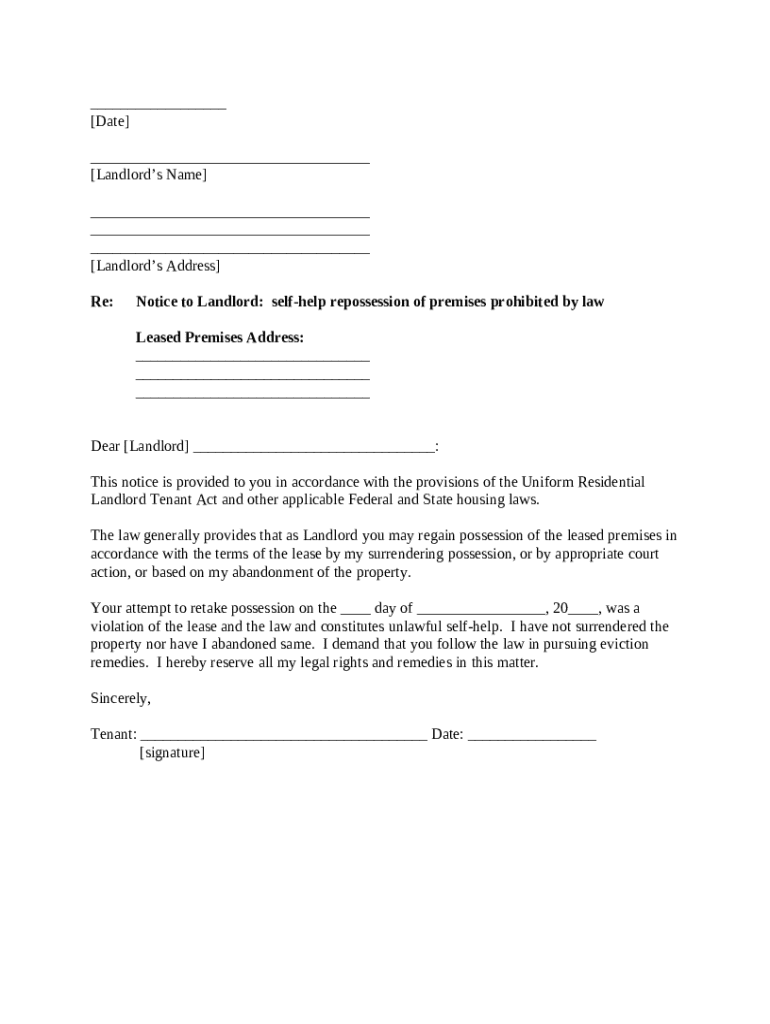Get the free Letter from Tenant to Landlord about Landlord using Unlawful Self-Help to Gain Posse...
