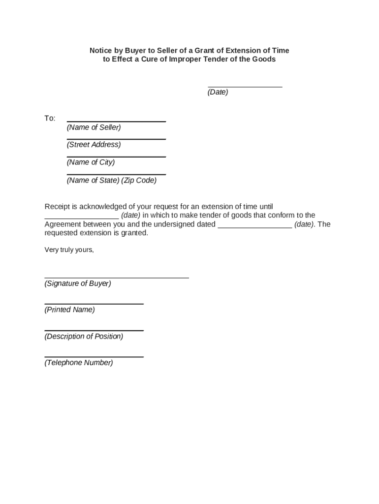 This form is a notice from a buyer of goods to the seller granting the seller an extension of time to effect a cure of an improper tender of the goods.