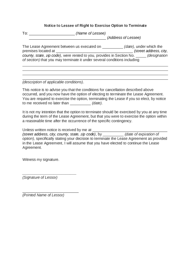 Get the free Notice to Lessee of Right to Exercise Option to Terminate template