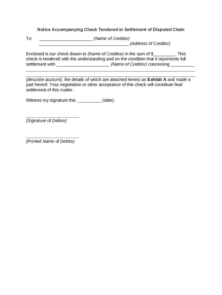 Get the free Notice Accompanying Check Tendered in Settlement of Disputed Claim template