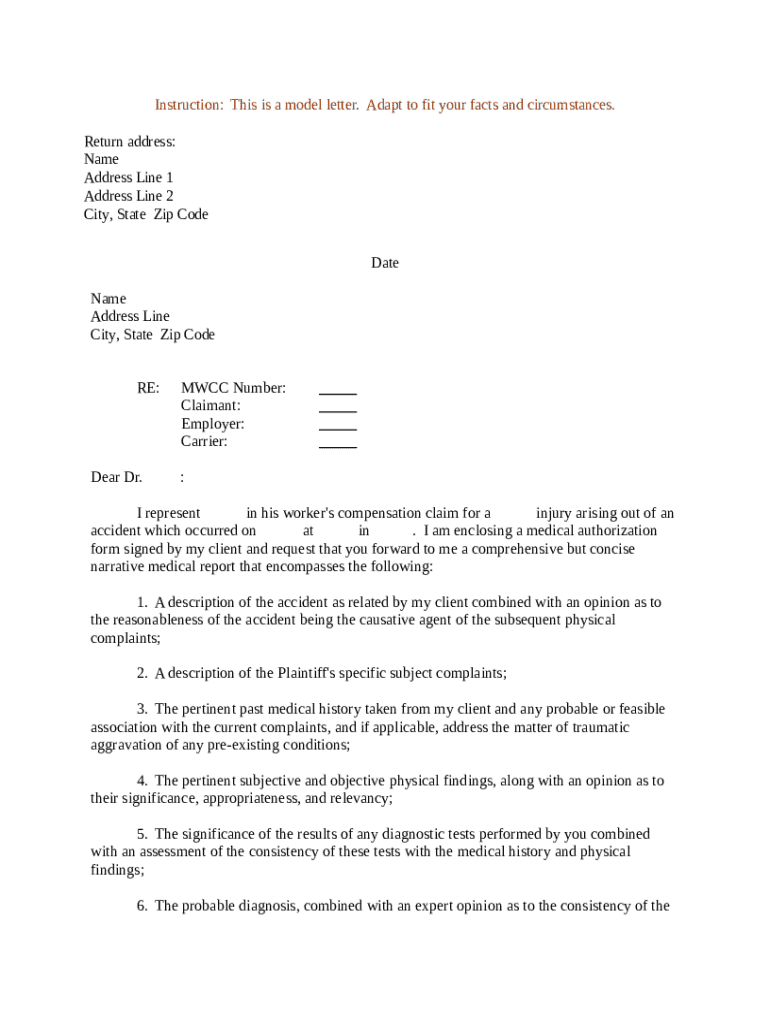 In your sample letter for a medical form, clear communication of key facts is vital. Begin with a detailed accident description that captures accurate accounts of events leading to the medical request. Documenting the patient's subjective complaints will help clarify specific issues experienced, while integrating relevant medical history lends credibility to the request.