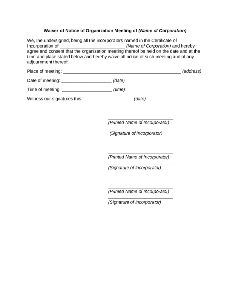 In conclusion, a waiver of notice of form form is indispensable for smooth organizational meetings and legal compliance. By understanding its components, execution process, and underlying legal considerations, incorporators can mitigate risks effectively. Always remember the importance of this document in facilitating the incorporation process and ensure thorough review and understanding before submission.