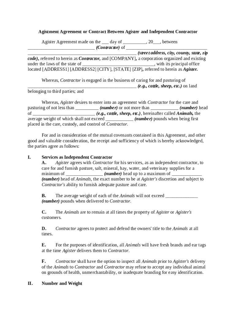 This includes essential details about both the Agister (the individual or entity providing the care) and the Contractor (the owner of the animals).