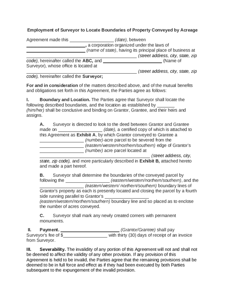 Get the free Employment of Surveyor to Locate Boundaries of Property Conveyed by Acreage template