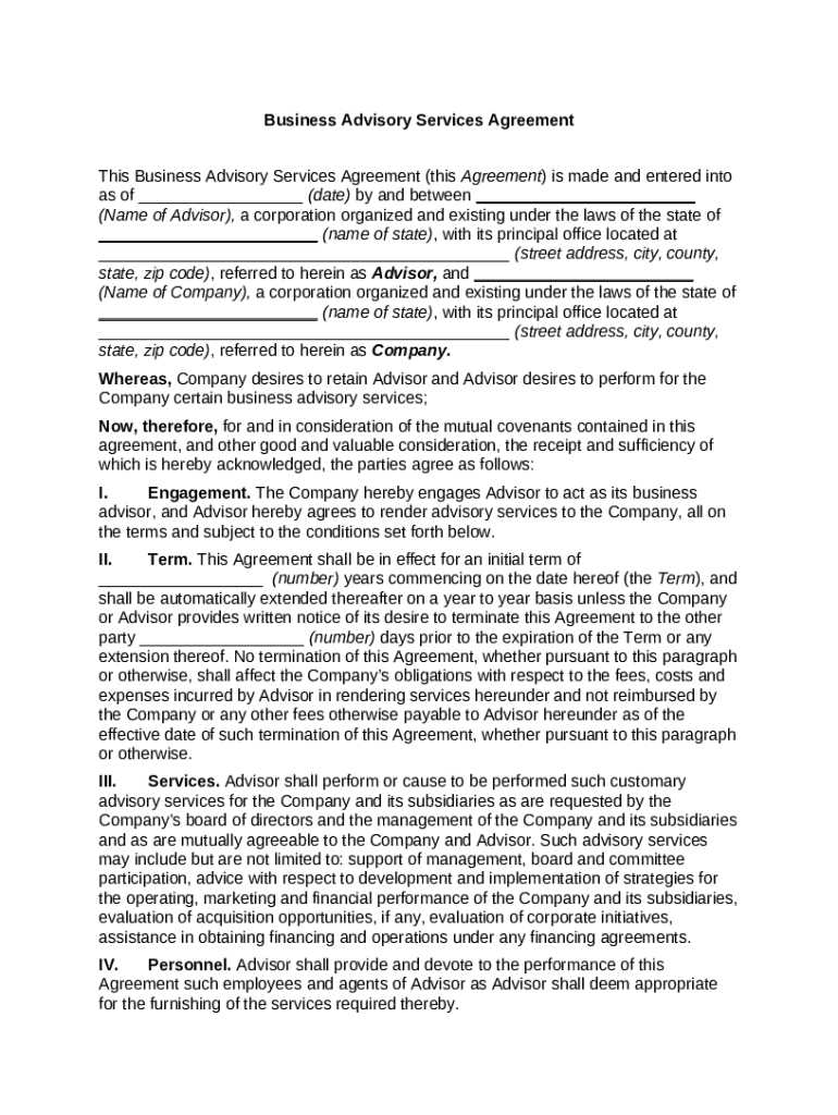 A business advisory services agreement is a legal contract outlining the terms and conditions between a client and a consultant providing advisory services.