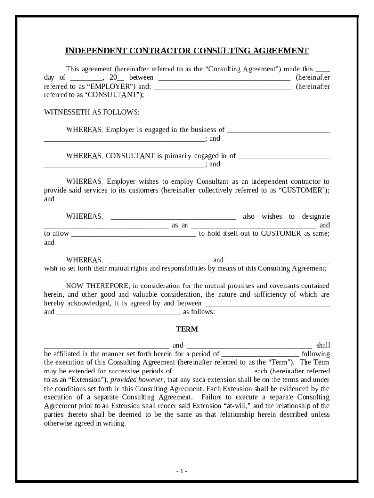 This form details an agreement between an employer and an independent contractor for consulting services. The agreement states that the employer wishes to designate the independent contractor to provide