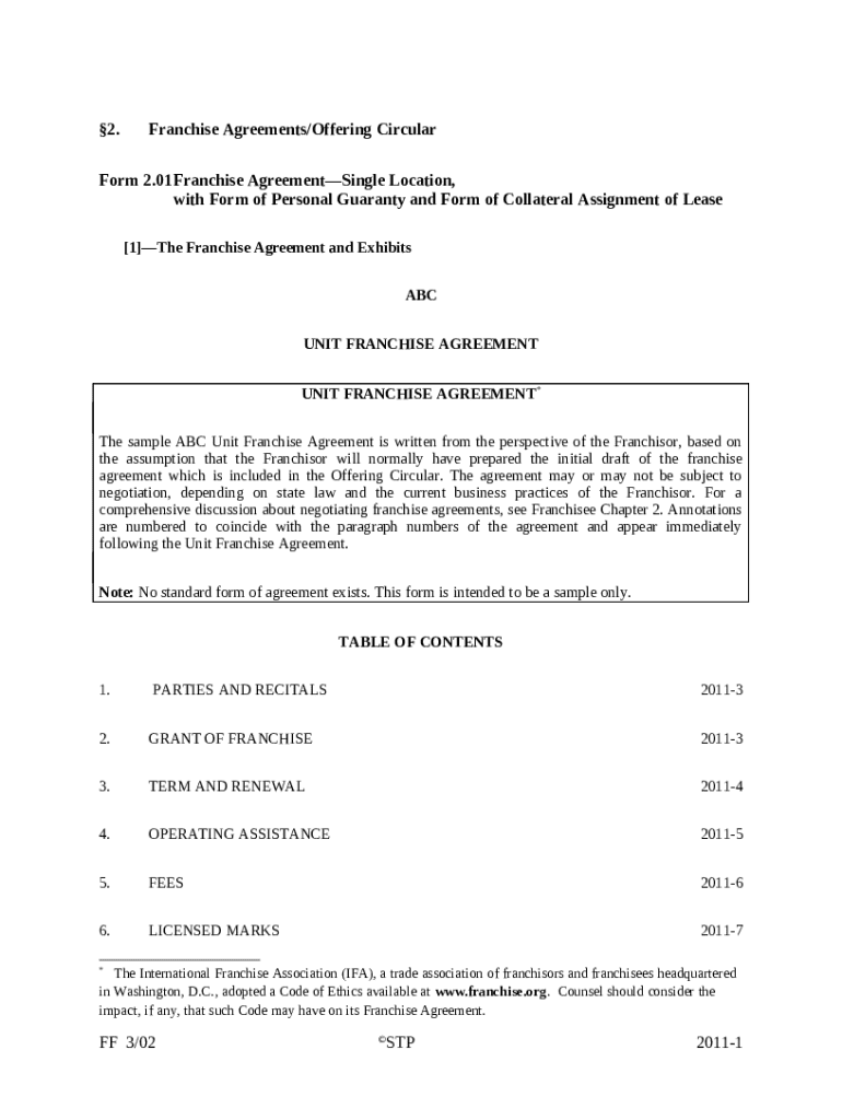 The ABC Unit Franchise Agreement features several crucial components, each playing a vital role in the overall structure of the franchise relationship. Key sections include the Grant of Franchise, Term and Renewal, Operating Assistance, and Fees, all of which need careful consideration.