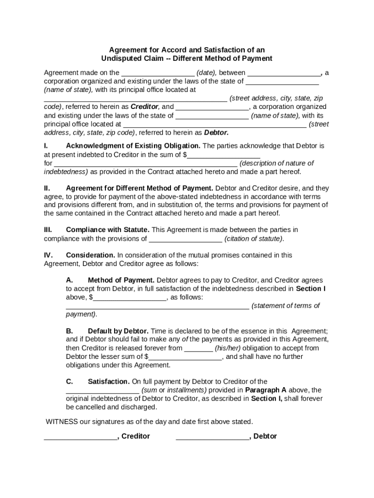 Get the free Agreement for Accord and Satisfaction of an Undisputed Claim--Different Method of Pa...