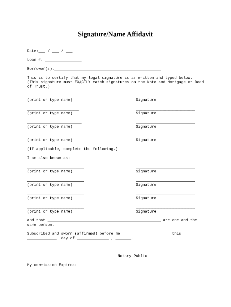 The signature and name affidavit serves as a verification tool in multi-step loan processes, where identity confirmation is paramount.