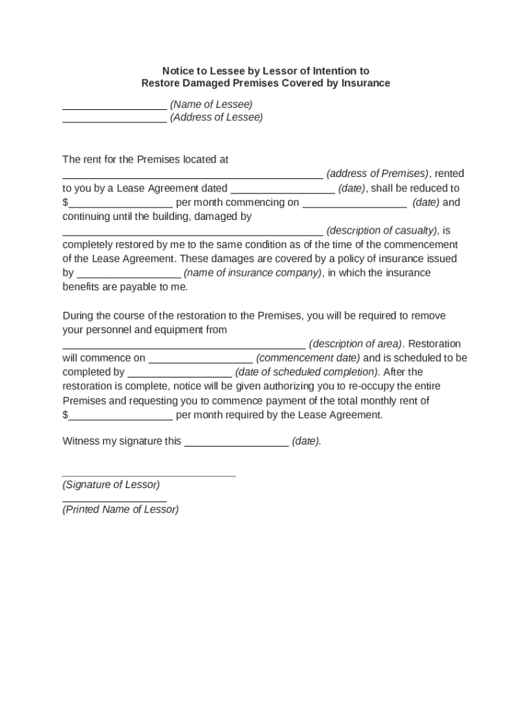 Get the free Notice to Lessee by Lessor of Intention to Restore Damaged Premises Covered by Insur...