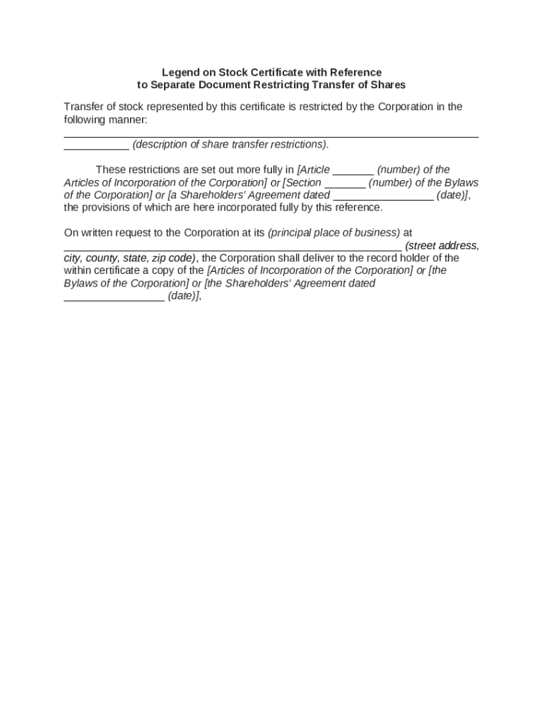 Get the free Legend on Stock Certificate with Reference to Separate Document Restricting Transfer...