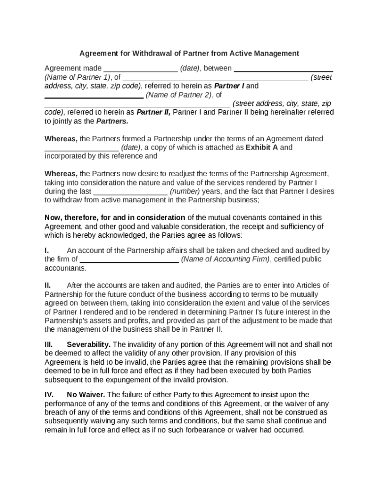 This form is an agreement for one partner to withdraw from the active management of a partnership.