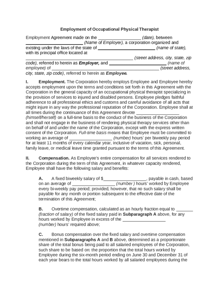 The compensation structure in employment agreements outlines not only the salary but also potential benefits, bonuses, and other financial incentives. This structure is critical because it influences job satisfaction and employee retention. Occupational therapists should thoroughly review this section to ensure it reflects their skills and industry standards.