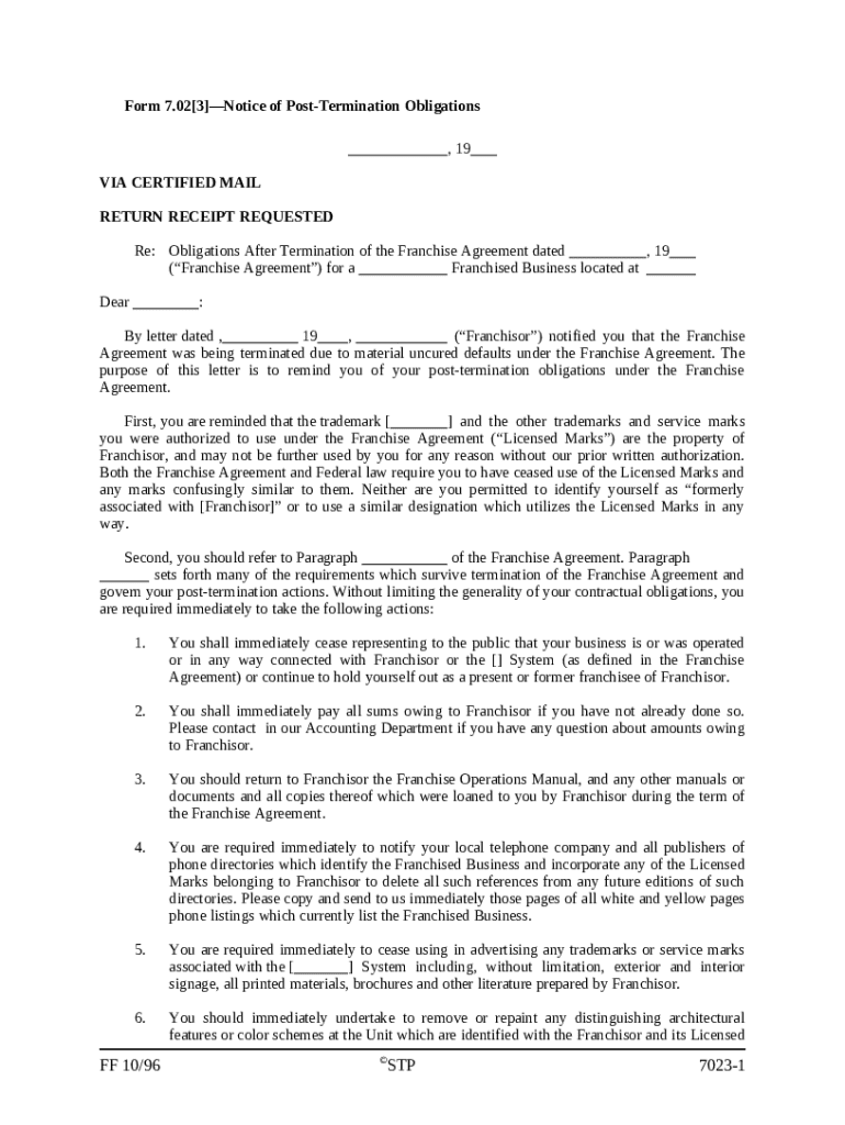Understanding how to fill out a notice of post-termination obligations form is crucial for franchisees. This form ensures that they comply with their responsibilities even after the termination of their franchise agreement, protecting both their interests and those of the franchisor.