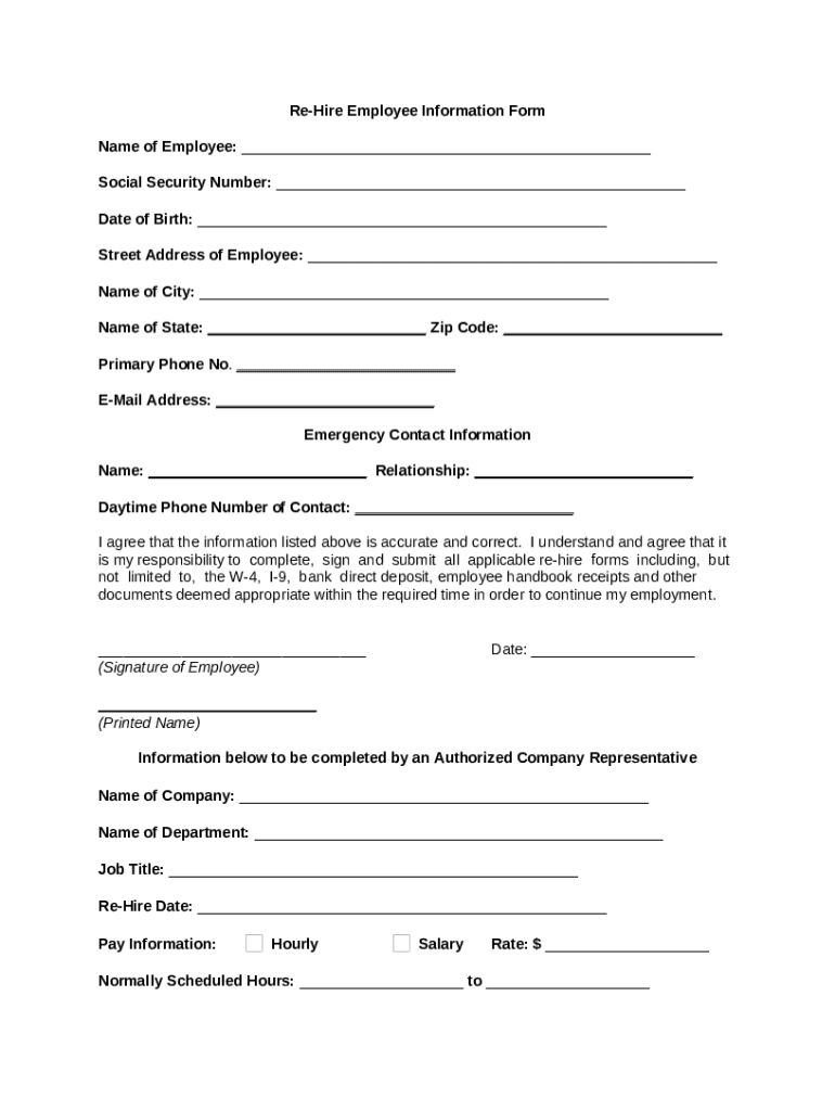 The acknowledgment clause in the re-hire employee information form certifies that all information provided is accurate. Employees must complete the signature, printed name, and date sections to give legal credence to the form. This step is imperative as it protects the organization from potential legal issues.
