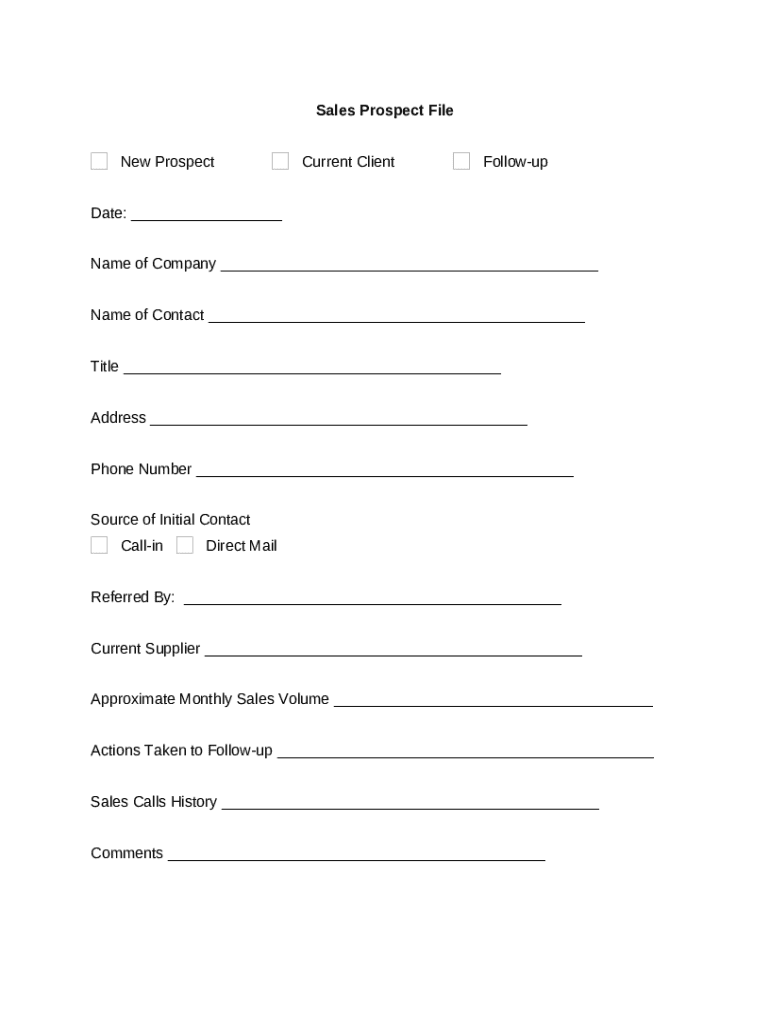 An effective sales prospect file form is organized into distinct sections that capture relevant information about potential and existing clients. Each field serves a specific purpose, ensuring that sales professionals can easily access and update data for new prospects, current clients, and follow-ups.