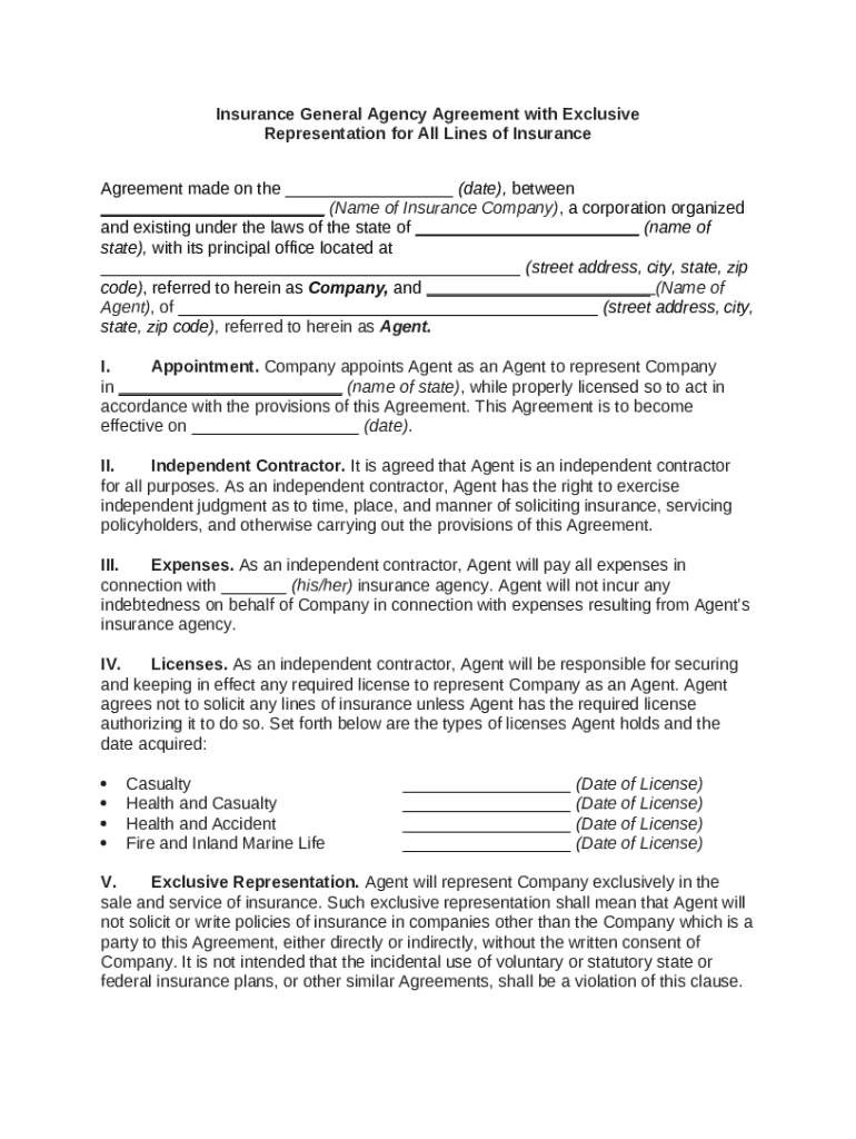 This form is a sample of an insurance general agency agreement with exclusive representation for all lines of insurance.