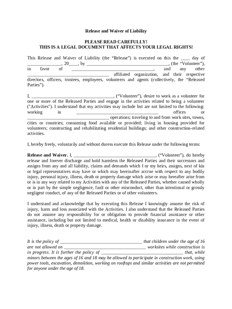 A release and waiver of liability for volunteer's working on contruction projects for non-profit type organizations such as Habitat for Humanity.